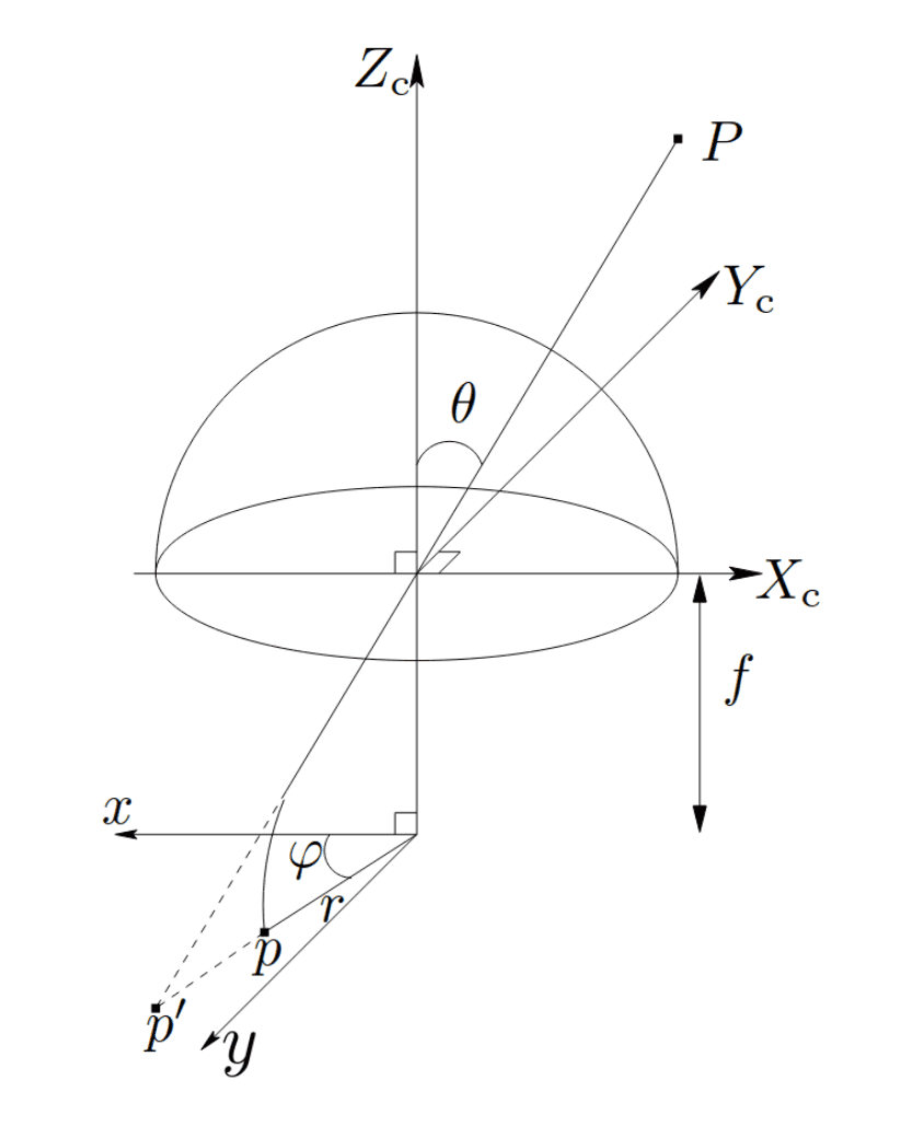 Above, we've shown the formula for $\theta$ when using perspective projection, but the main advantage of the Kannala-Brandt model is that it can support different kinds of projection by swapping our formula for $\theta$, which is what makes the distortion function smoother for wide-angle lenses. See the following figure, shared here from the original paper, for a better geometric description of $\theta$: