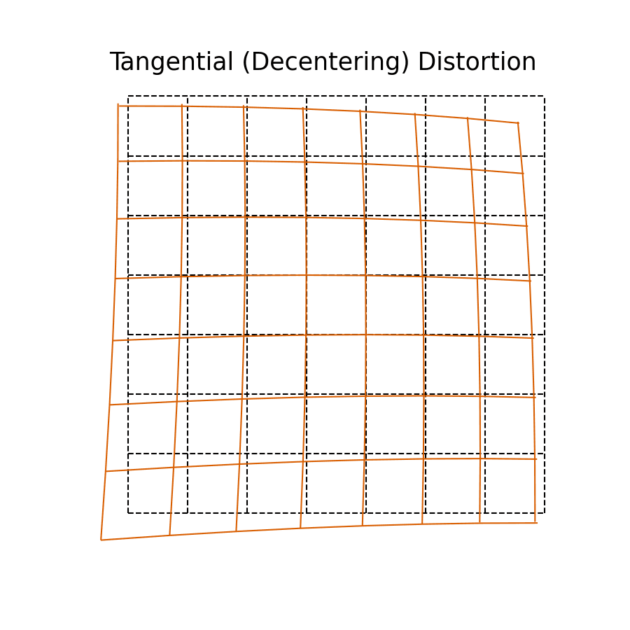 Tangential distortion is sometimes also called de-centering distortion, because the primary cause is due to the lens assembly not being centered over and parallel to the image plane. The geometric effect from tangential distortion is not purely along the radial axis. Instead, as can be seen in the figure above, it can perform a rotation and skew of the image plane that depends on the radius from the image center!