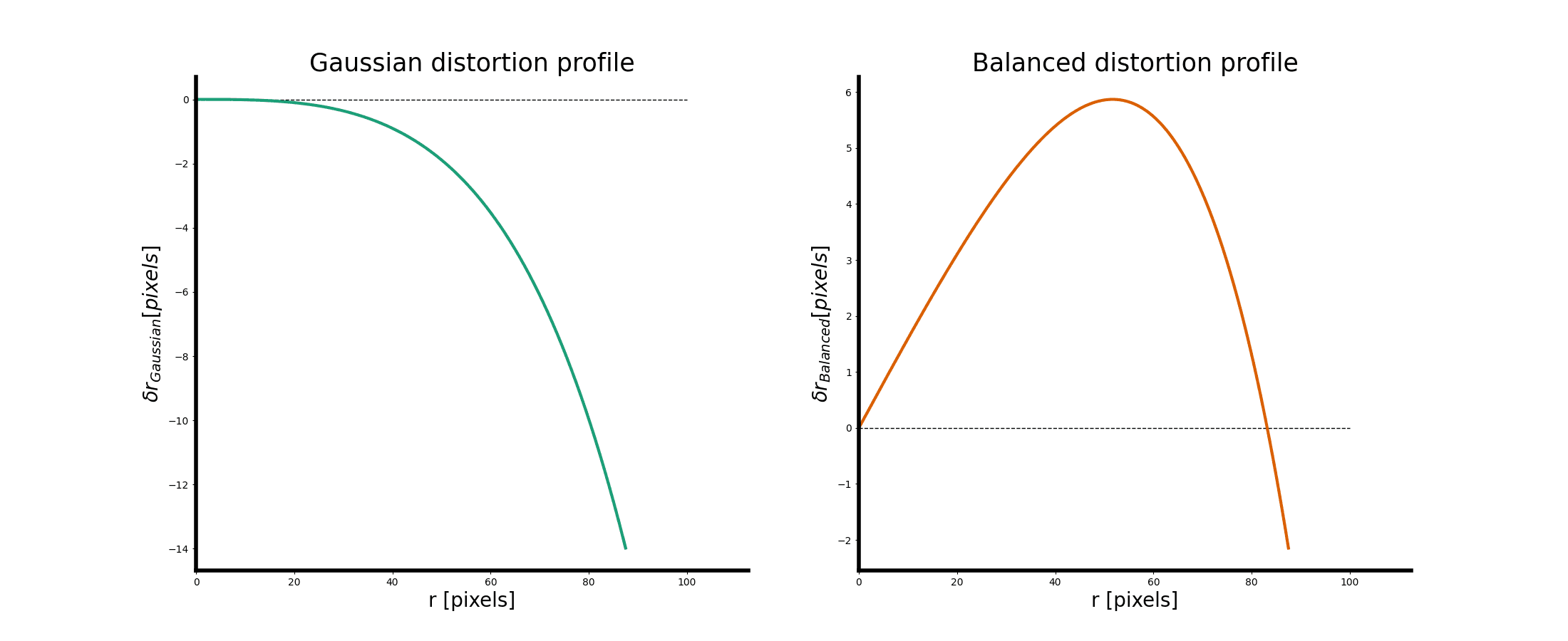 See this example comparing two equivalent distortion models. The left describes the Gaussian distortion profile, whereas the right hand side describes a Balanced distortion profile. The distortions are effectively the same, but the model is transformed in the balanced profile scenario; the balanced profile allows us to limit the maximum distortion of the final distortion profile while still correcting for the same effects.