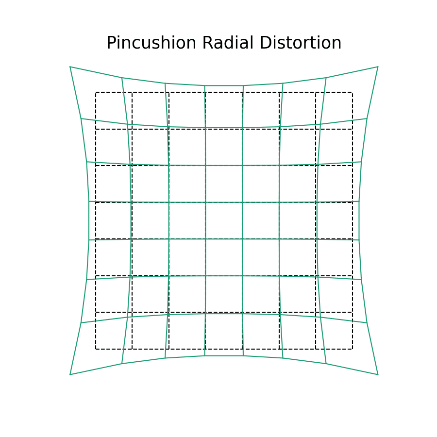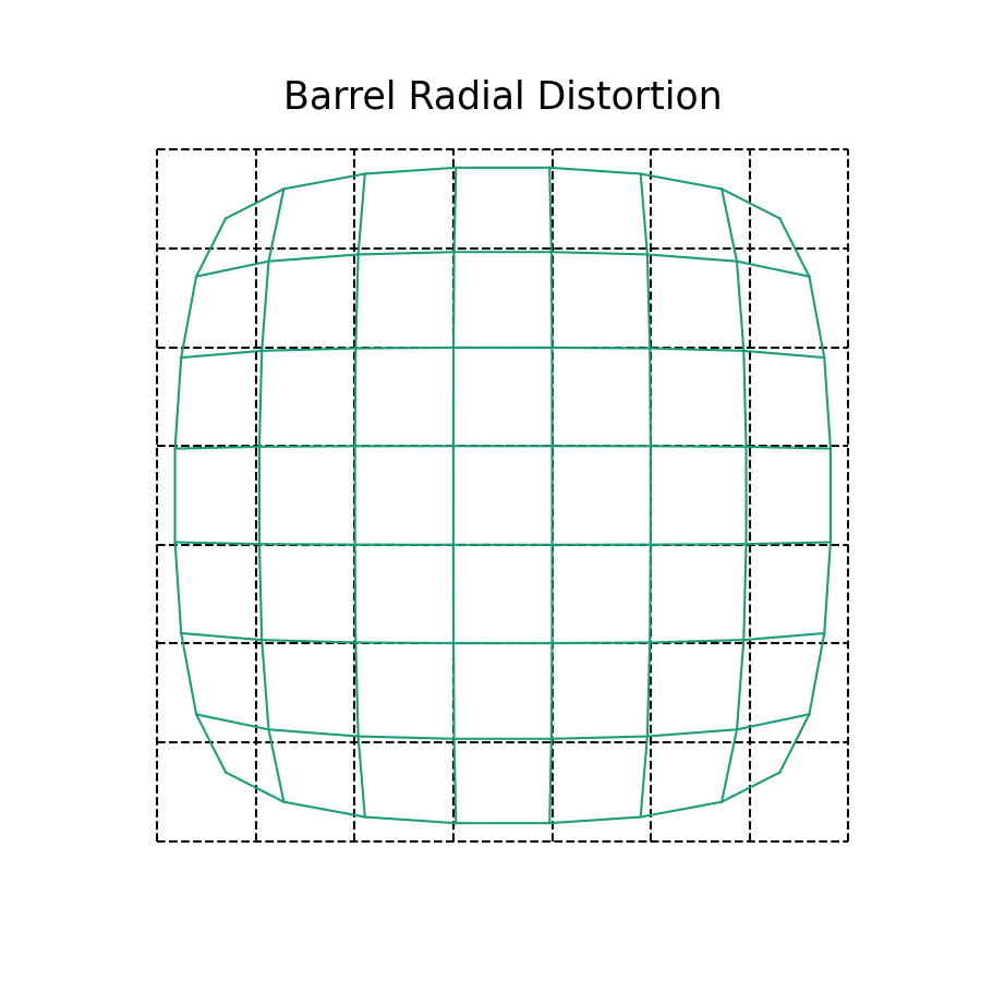 While the two distortions might seem as if they are fundamentally different, they are in fact quite alike! The amount of distortion in the teal lines is greater in magnitude at the edges of our image plane, while being smaller in the middle. This is why the black and teal lines overlap near the center, but soon diverge as distance increases.