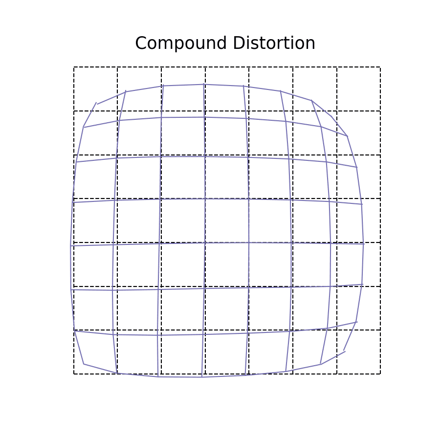 Typically when we think of distortion, we try to break down the components into their constituent parts to aid our understanding. However, most lens systems in the real world will have what is often referred to as compound distortion. There's no tricks here, it's simply an aggregate effect of all the previous types of distortions in some combination. This kind of distortion is especially prevalent in cameras with compound lenses, or very complicated lens assemblies.